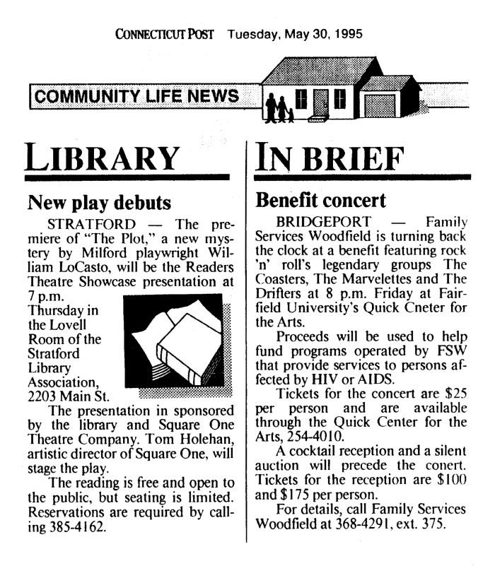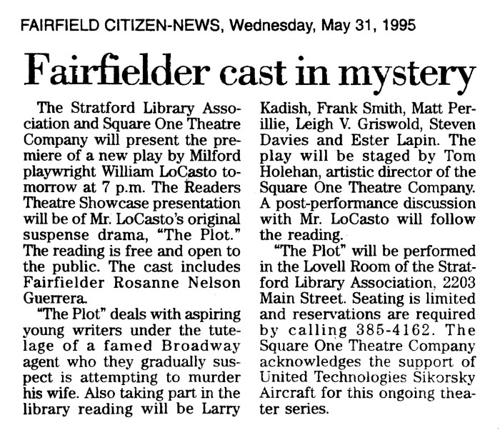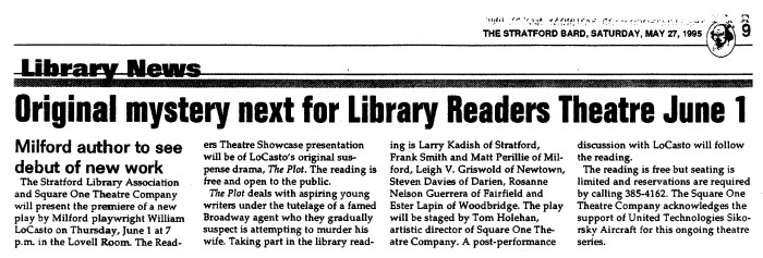 The journey from page to production was a long one for The Plot: A Murder Mystery. Originally titled simply The Plot, the play had its first staged reading, and the first presentation of my work on any stage ever, on June 1, 1995, at The Stratford Library Association in Stratford, Connecticut, directed by Tom Holehan, the Artistic Director of Square One Theatre Company in Stratford, a position he proudly maintains today.